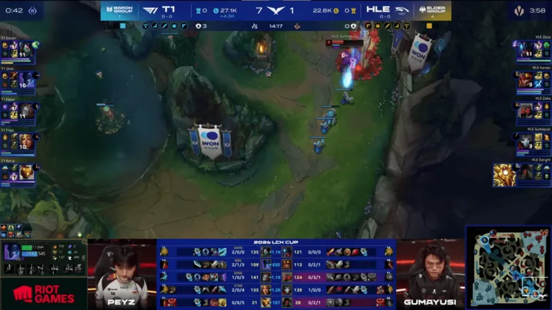 比赛第14分钟,T1野区再度打出0换3后扩大优势→