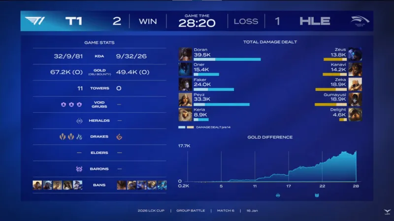 虎扑01月16日讯 【GAME3】T1蓝色方、HLE红色方