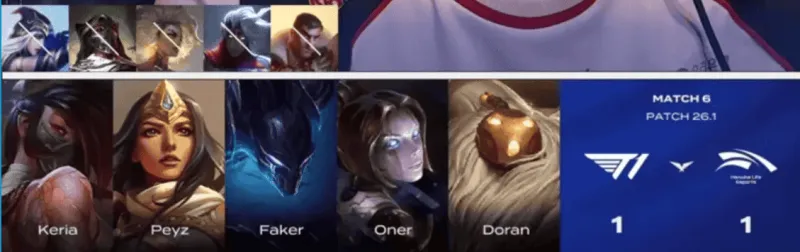 T1选用:Doran阿卡丽、Oner梦魇、Faker发条、Peyz希维尔、Keria巴德