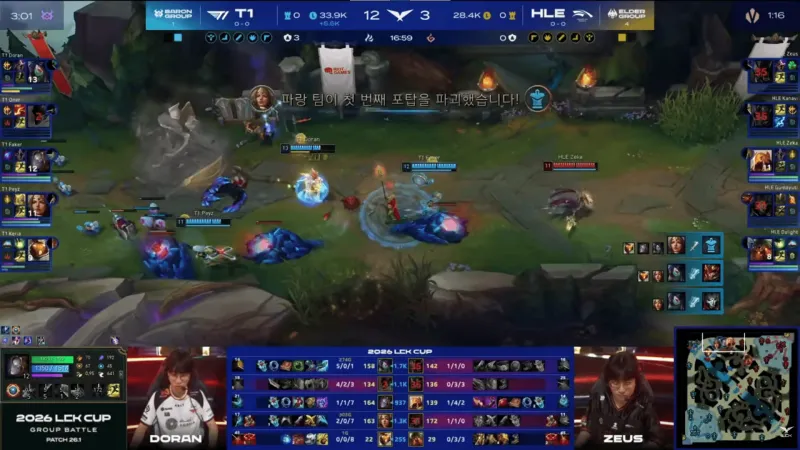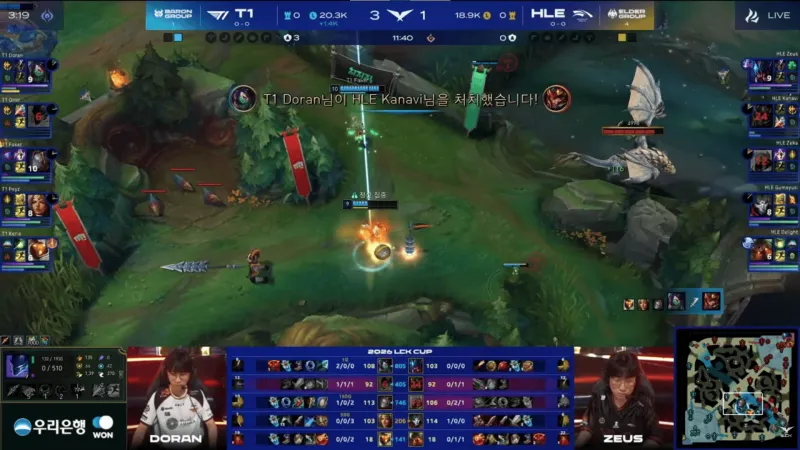 比赛第20分钟,Doran阿卡丽单杀Kanavi皇子,随后T1先后击杀HLE三人拿下大龙→